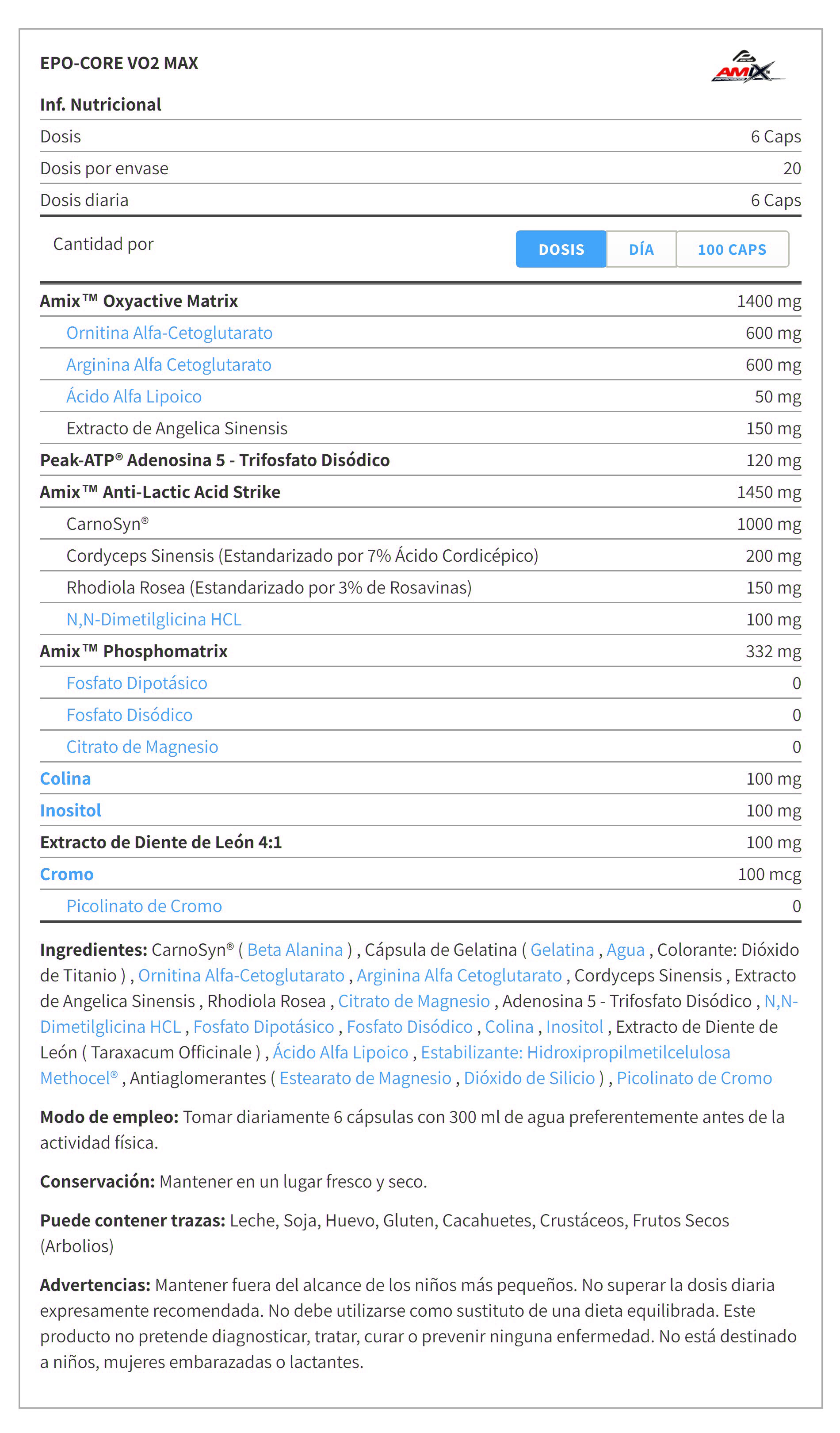 EPO-Core VO2 Max Formula de Amix™ Performance Series es un suplemento en cápsulas que contiene una exclusiva y avanzada fórmula de pre-entrenamiento específicamente diseñada para mejorar el rendimiento deportivo y el transporte de oxígeno.